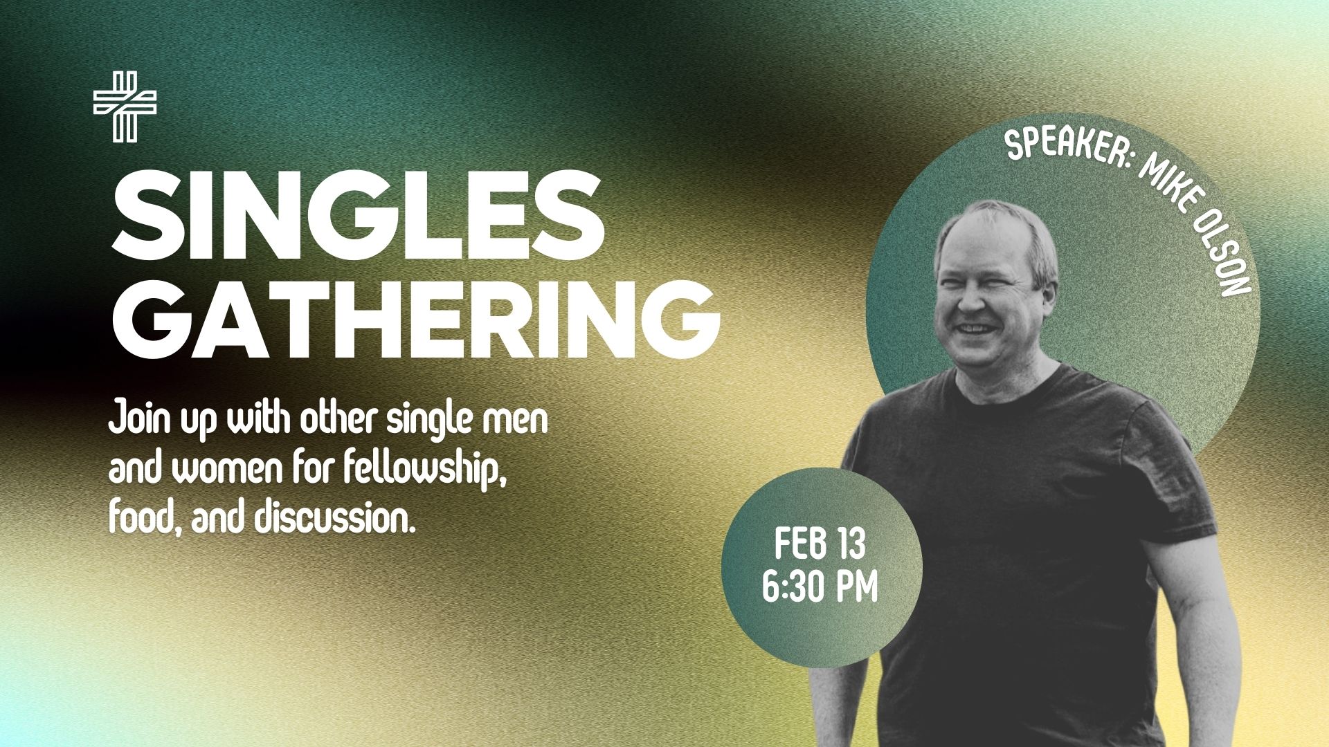 Join together with other single men and women for fellowship, food, and discussion! Our guest speaker (Mike Olsen) will be sharing his experience with singleness and living life with purpose.