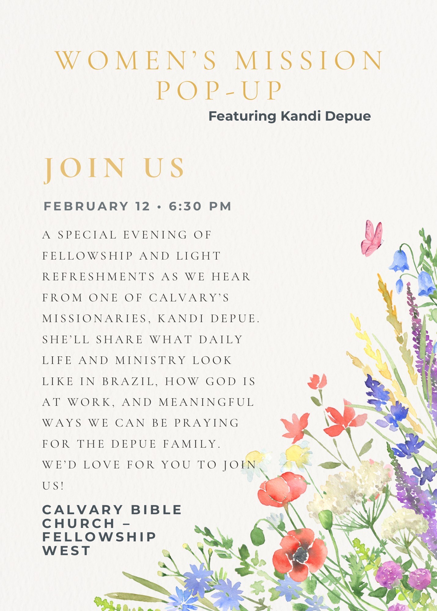 Join us for a special evening of fellowship and food as we hear from one of Calvary’s missionaries, Kandi Depue. She will share what daily life and ministry looks like in Brazil, how God is at work, and meaningful ways we can be praying for the Depue family. We’d love for you to be a part of it!